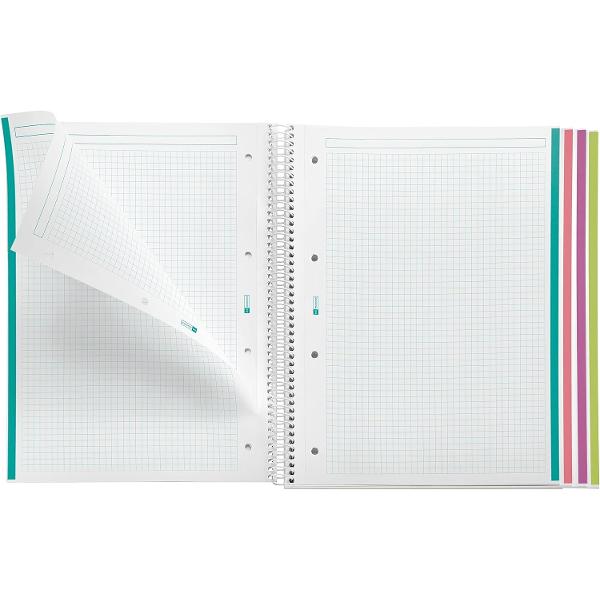 - 120 FOI PĂTRATE 5 mm, cu antet pentru titluri și 4 dungi de culoare pentru a vă putea clasifica notele. Imprimarea offset de înaltă calitate oferă o mai mare subtilitate și curățenie scrisului, facilitând citirea și studiul.