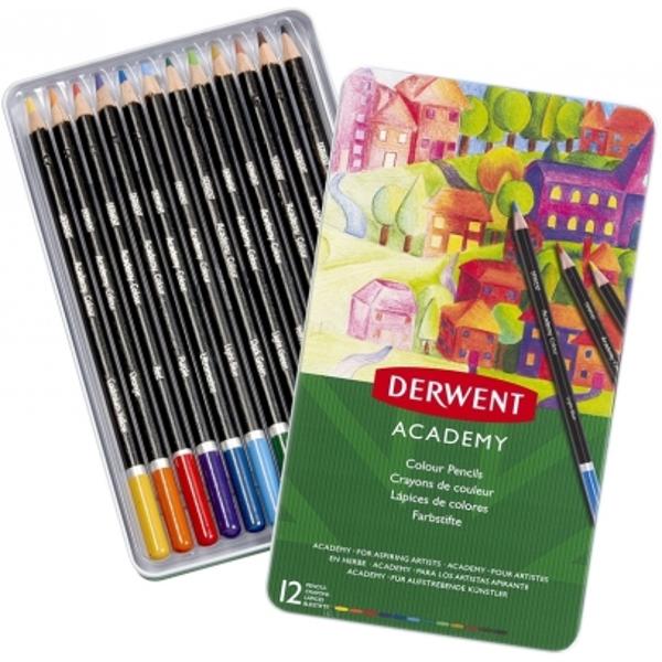 Conținut: 1 x set de 12 creioane de colorat Derwent Academy, numele culorii scris în relief cu alb, vârf rotunjit pentru ascuțitori standard.