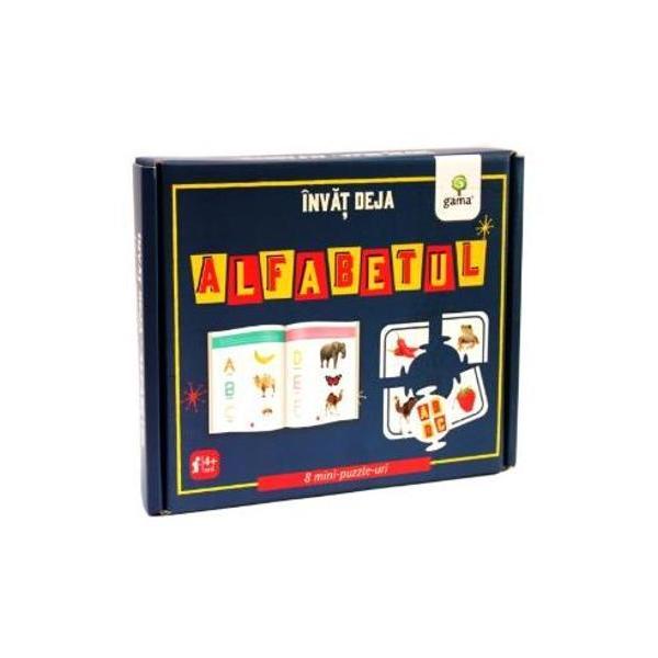 Cutia conține carte de 16 pagini și 8 puzzle-uri pentru învățarea alfabetului.